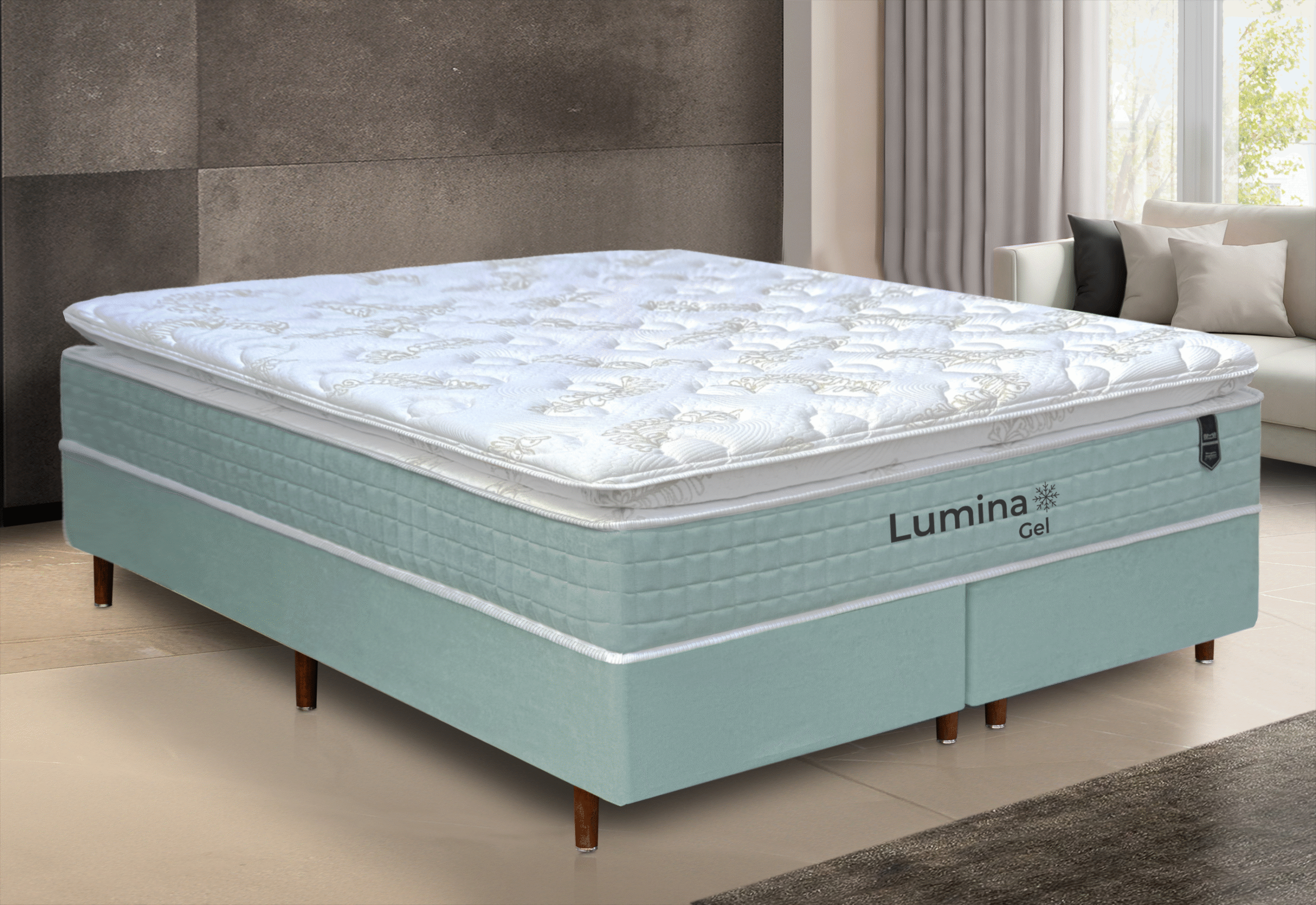 O colchão Lumina Gel combina tecnologia avançada com alto conforto. Sua espuma SoftGel D35 com partículas de gel proporciona toque macio e frescor contínuo durante a noite.