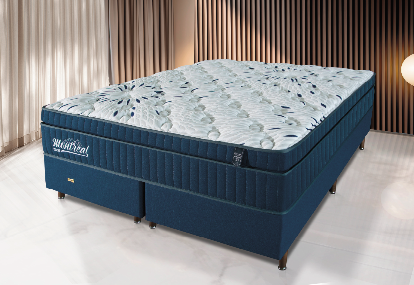 O conjunto box Montreal une luxo e inovação para transformar suas noites de sono. Com Euro Pillow moderno, base Slim Invertida e pés de madeira, oferece um design sofisticado. Sua combinação de espuma macia e molas ensacadas garante suporte personalizado e conforto envolvente. Inspirado em Montreal, traz tons frios e um visual contemporâneo que cria um ambiente de tranquilidade no quarto. Mais que um colchão, é um convite diário ao descanso digno de realeza.